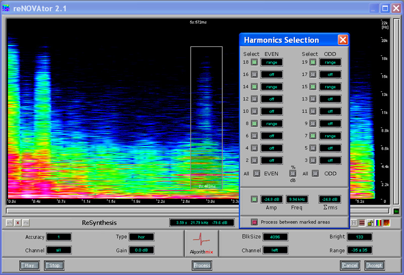 Time-saving, high-resolution audio repair processor freeing problematic live recordings from unwanted tenacious audio disturbances. ReNOVAtor helps when all other audio tools and editing tricks fail. It can eliminate disturbing audio events while perfectly preserving the sound quality of your original material, because every spectral modification is executed in linear-phase domain.