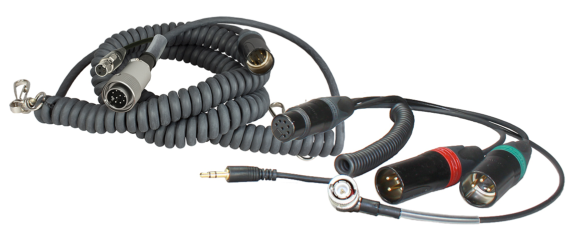 7-pin XLR female to dual 3-pin XLR male and mono return via 3.5mm TRS miniplug on coiled cord with BNC right angle plug |