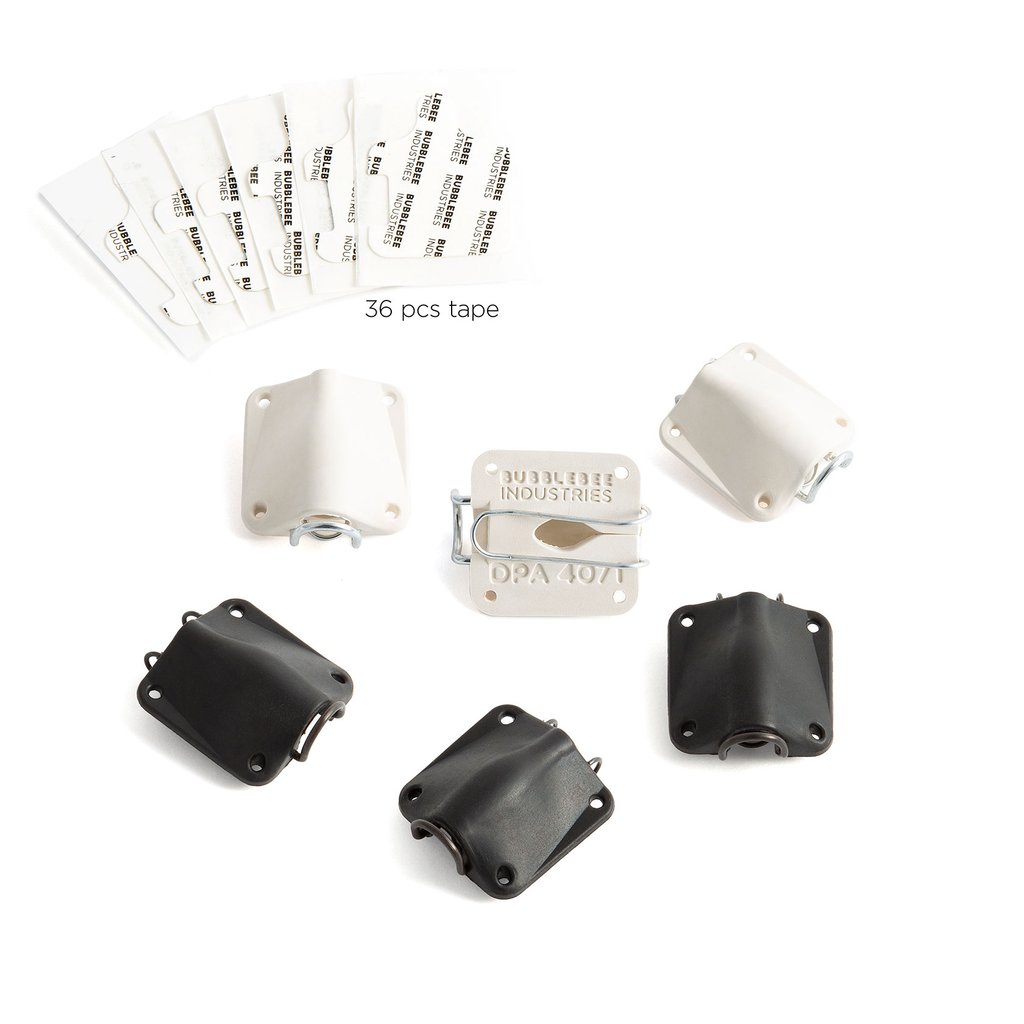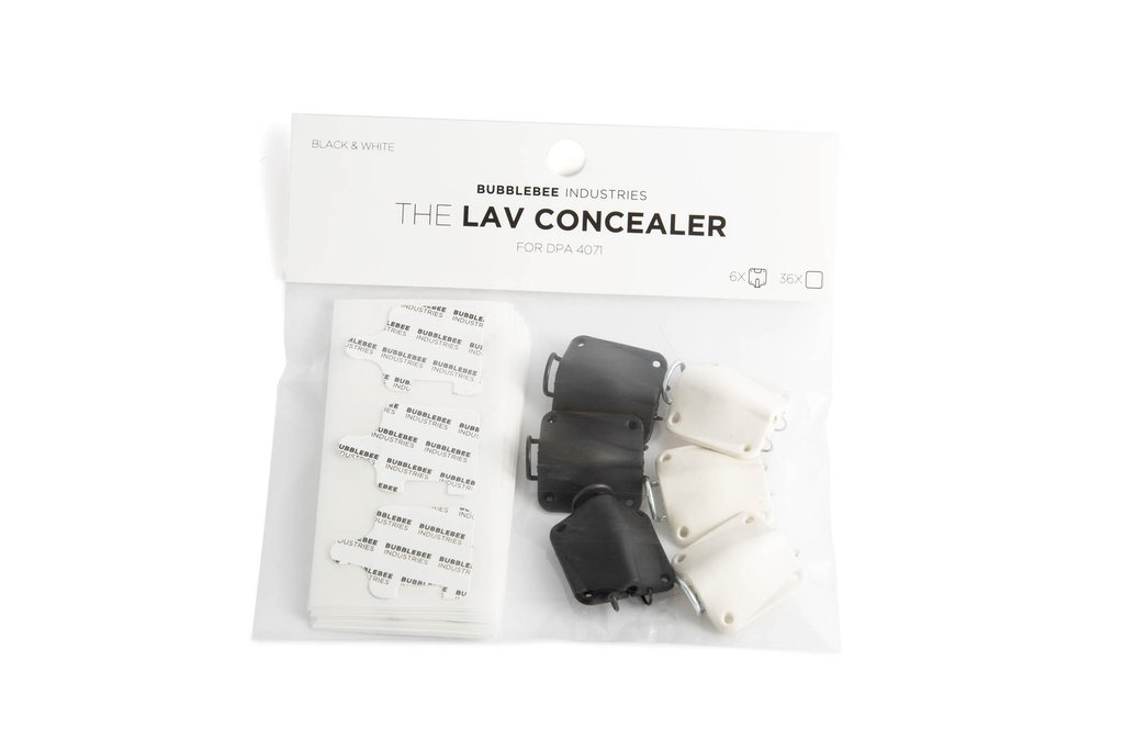 Presented as a set of six (three black and three white), the Lav Concealer for DPA 4071 from Bubblebee Industries is for mounting the DPA 4071 lavalier microphones (available separately) on the body and in clothing or costumes, making it ideal for broadcast, theater, and television production. This soft, pliable mount also acts as a shockmount and barrier, protecting the microphone capsule from vibrations and friction, and giving you cleaner audio quality. In addition, each Lav Concealer includes a customizable clothing clip, a wire fabric guard, and six pieces of The LAV Concealer tape.