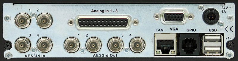 8-ch digital AES3id I/O (BNC), 8-ch analog input (Sub-D), Ethernet, VGA, 2 x USB 2.0, GPIO, 24 V DC connectors.