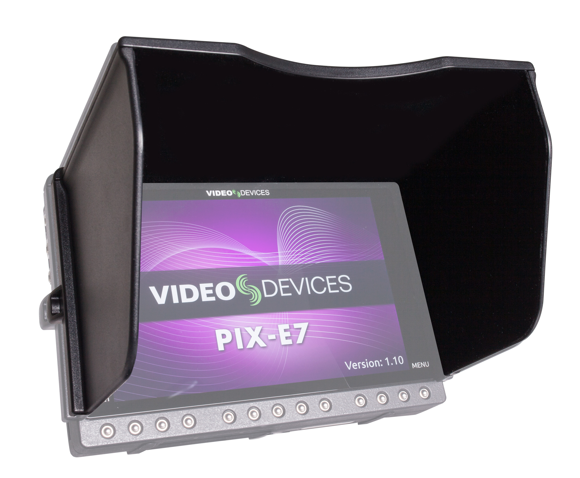 Sun hood for PIX-E7 Portable video recording monitors. Magnetic connection. 7.75" W X 4.5" H X 5.375" D.