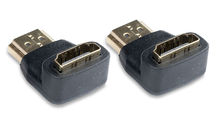 Right angle adapter HDMI Type A male plug - HDMI Type A female jack. Helps with cable management between monitor and camera. Includes two adapters.