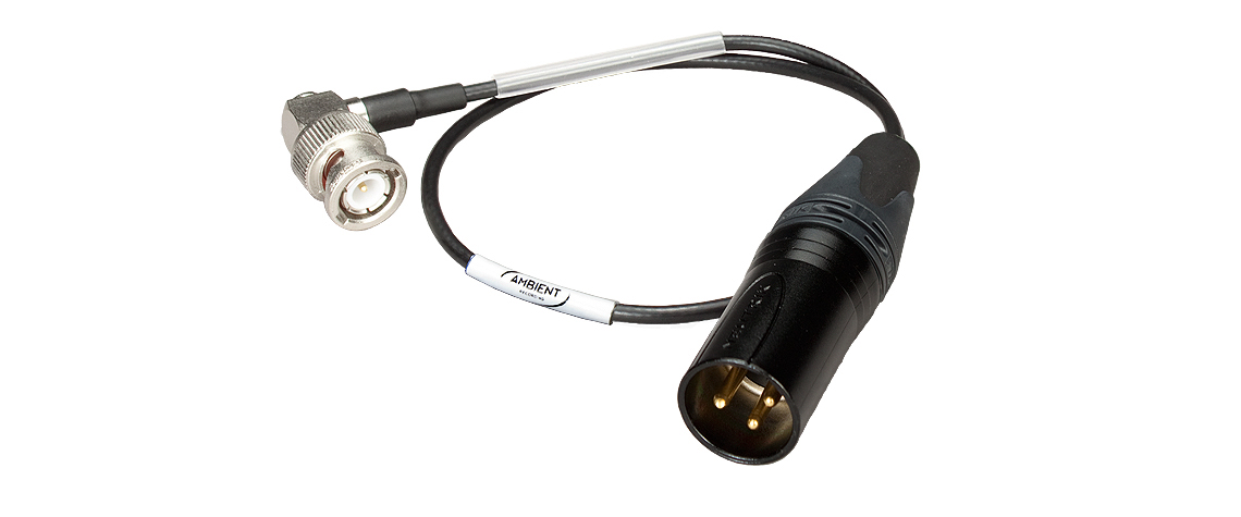 The black 15.8” Right Angle to 3-Pin XLR Male Timecode-Out Cable from Ambient Recording is designed for use with the Time Code Clockit Devices. This cable features a 90° BNC connector at one end and a 3-pin XLR male connector on the other end.