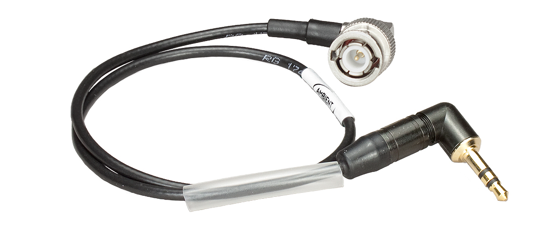 The Ambient Recording BNC3.5-MIC Timecode-Out Cable is a right angle BNC to 3.5mm TRS (stereo) plug connector cable. It includes a 40 dB pad to the microphone level wired only to the right channel.