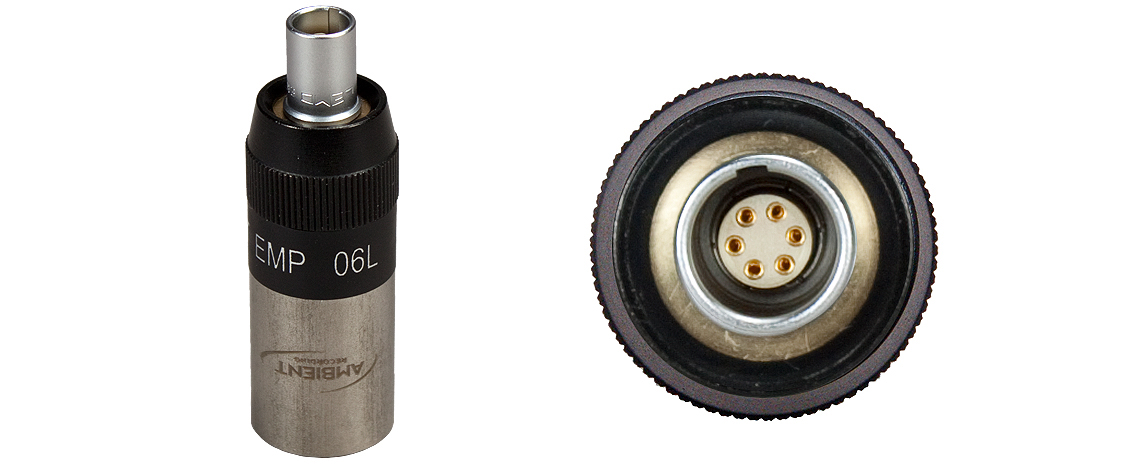 The EMP06L Electret Microphone Power Adapter from Ambient Recording allows hardwired use of a lavalier mic by converting phantom 48V to 5.6V electret power, and outputs an electronically balanced signal with low impedance. This adapter is designed for use with Micron 700 Series and Explorer Series microphones, and converts a 6-pin LEMO connector to a standard 3-pin XLR male connector.