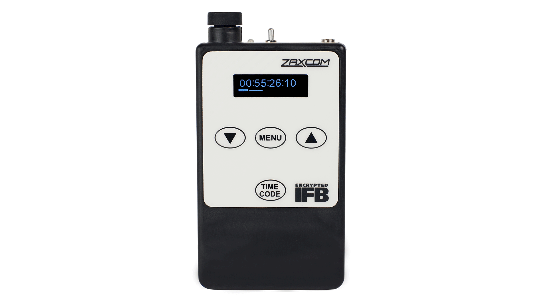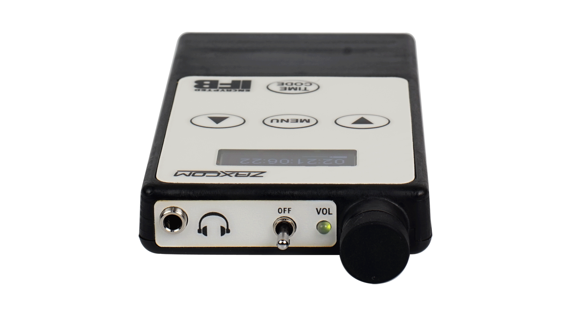 The ERX3TCD features an OLED display, locking headphone connector a practically unbreakable rubber volume knob. It receives high quality encrypted digital audio and timecode from any ZaxNet source. The OLED display shows timecode, user bits, current Scene and Take metadata in real time with a hold button to freeze the display.