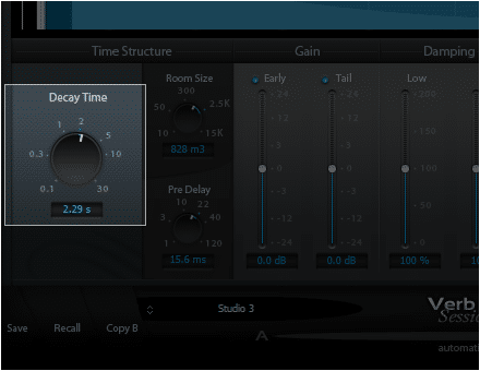 • Decay Time adjusting the duration of the reverberation tail in seconds.