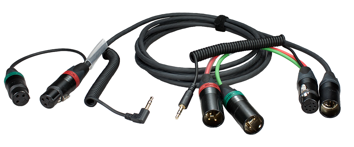 2x 3-pin XLR female and 3.5 mm TRS right angle plug to 7-pin XLR male