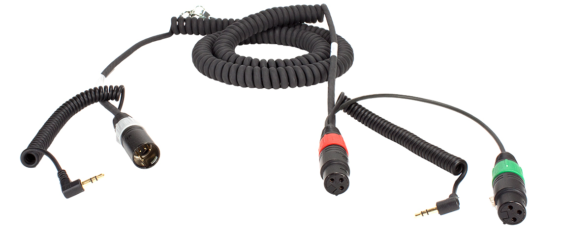 Coiled mixer/camera loom, 2x XLR-3F + 3.5 mm TRS to XLR-5M