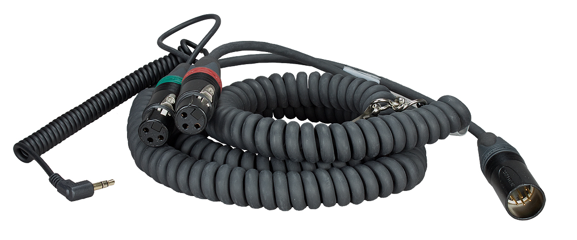 Coiled mixer/camera loom, 2x XLR-3F + 3.5 mm TRS to XLR-7M