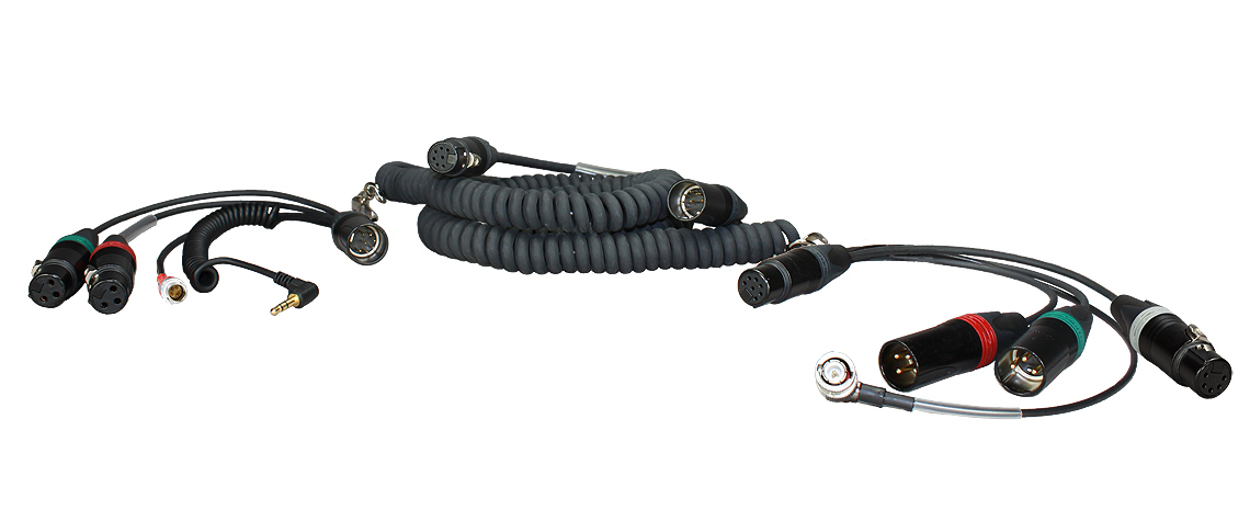 Coiled mixer/camera loom, Hirose 12-pin + HBY7-35 The 4.6 to 16.4’ HBS12HY7-35 7-Pin XLR Female to Dual 3-Pin XLR Male Coiled Breakaway Cable from