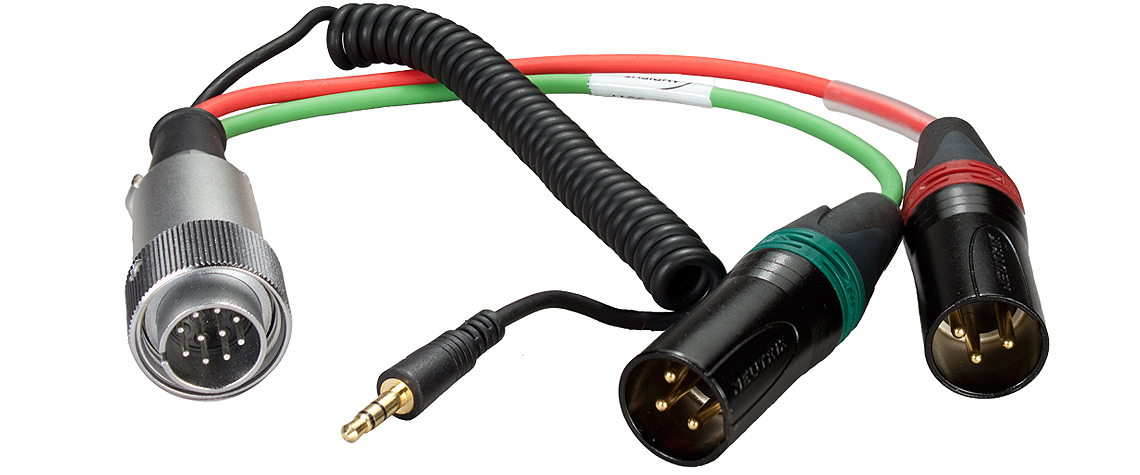 10-pin Hirose male to dual 3-pin XLR male connector and returns via a TRS mini plug on coiled cord |