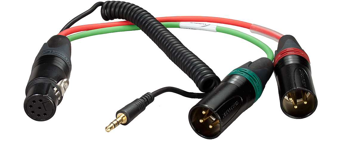 7-pin XLR female to dual 3-pin XLR male connectors and returns via TRS mini plug on coiled cord |