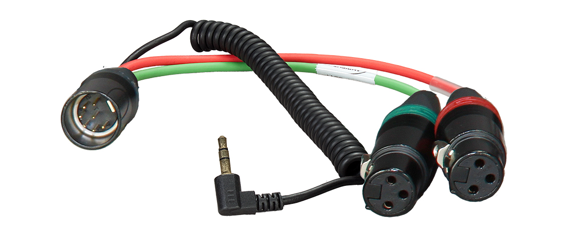 7-pin XLR male to dual 3-pin XLR female connectors and returns via TRS mini right angle plug on coiled cord |