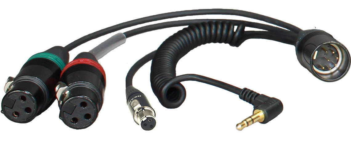 The HBYATC7-35W Breakout Y-Cable from Ambient Recording features the mixer-side Y-cable for a Sound Devices 552 mixer-camera loom. At one end of this Y cable is a 7-pin XLR connector. On the other end are two XLR connectors, one 3.5mm TRS, and a TA3F connector.