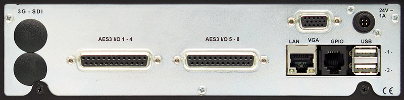 16-ch AES3 I/O (2 x Sub-D),Ethernet, VGA, 2 x USB 2.0, GPIO, 24 V DC connectors.