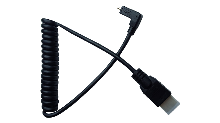 Full HDMI to right -angle Micro HDMI Coiled cable. Length range = 11.8" (29.97cm) to 17.7" (45cm). For use with PIX-E Recording Monitors & PIX-240i