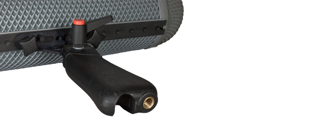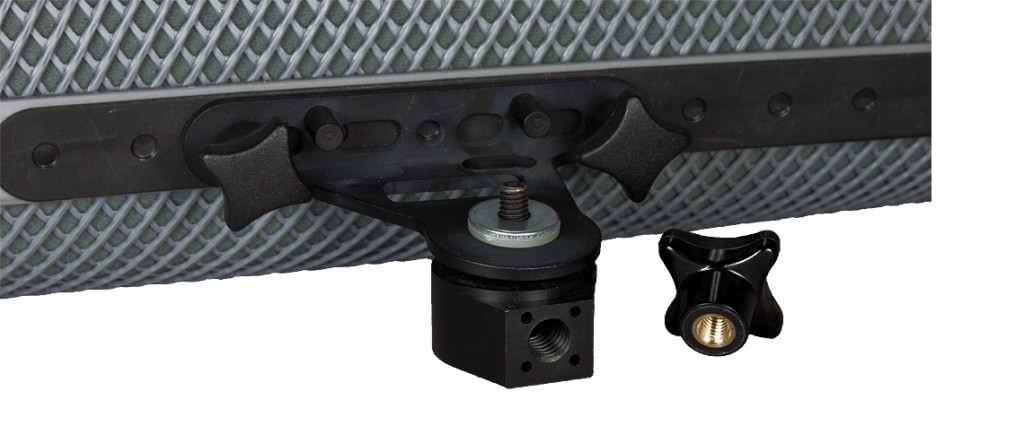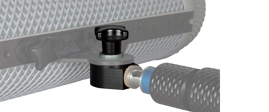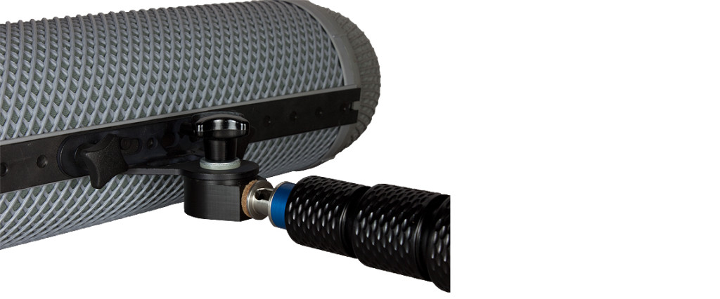 The universal flange adaptor (QFR) has a 3/8“ female thread and gives you the possibility directly mounting your Rycote wind shield to your boom pole in a second. Remove the pistol grip first, then assemble the Rycote adaptor on the Rycote attachment;