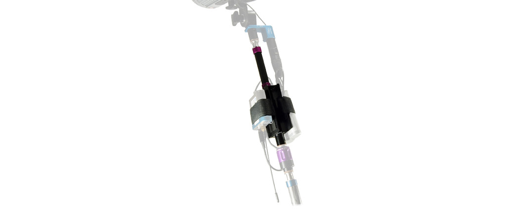 The Quickpole Wireless Boom (QWB) resembles a mounting plate for transmitter and the mic power supply at the tip of the boom.