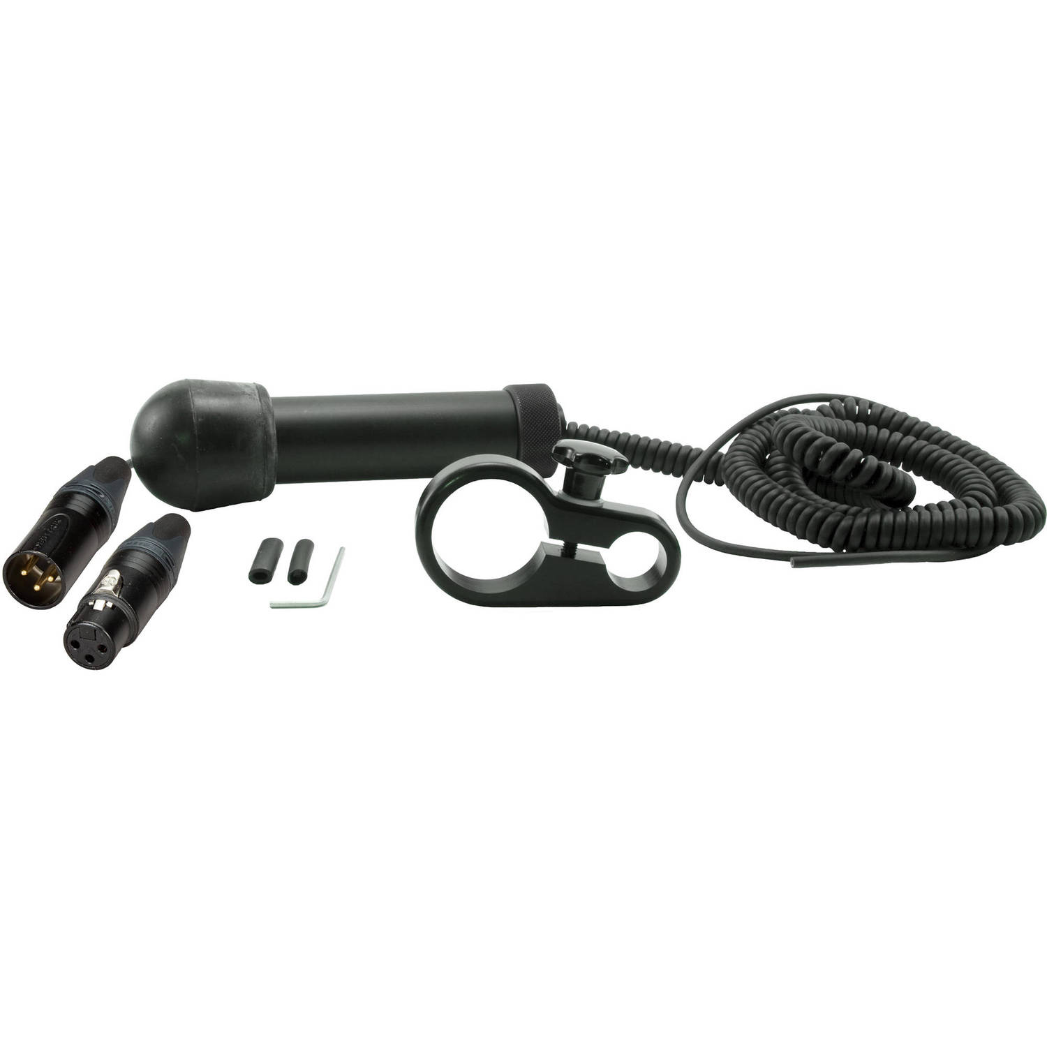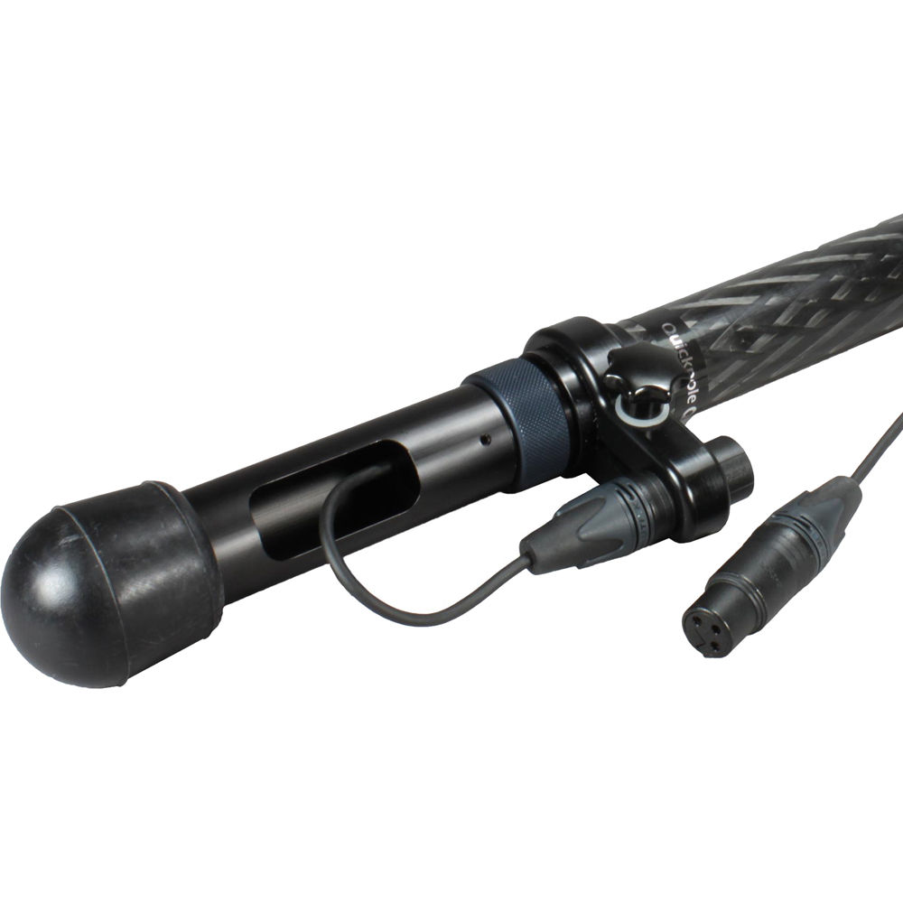 The QXCCM-65 from Ambient Recording is a cable kit featuring a coiled cable and two 3-pin mono XLR connectors for the QX 565 quickpole light boom pole. The cable goes through a side outlet in the pole. The kit includes an inner cable strain relief made out of POM, a base made out of POM with two threaded holes, two grub-screws M4 and a matching Allen key, an outer shell made from anodized aluminum, a knurled ring nut for mounting on to the boom, a rubber bumper, a rubber sleeve, and a heat-shrinkable sleeve.