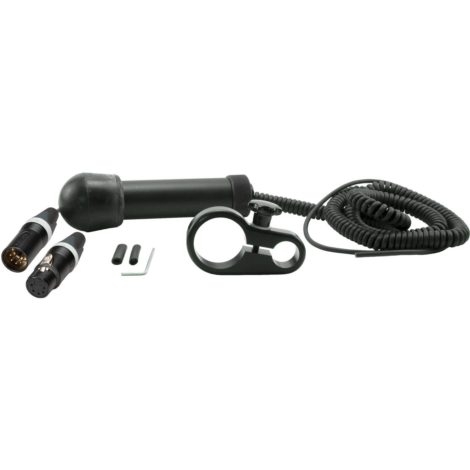 The QXCCS-65 from Ambient Recording is a cable kit featuring a coiled cable and two 5-pin stereo XLR connectors for the QX 565 quickpole light boom pole. The cable goes through a side outlet in the pole. The kit includes an inner cable strain relief made out of POM, a base made out of POM with two threaded holes, two grub-screws M4 and a matching Allen key, an outer shell made from anodized aluminum, a knurled ring nut for mounting on to the boom, a rubber bumper, a rubber sleeve, and a heat-shrinkable sleeve.