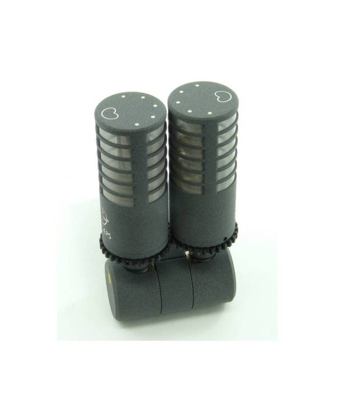The overall width of the two microphones combined is similar to (often less than) the diameter of a conventional stereo microphone’s capsule assembly. This is possible by using the smallest non-electret condenser microphones with balanced outputs, the CCM Compact Condenser Microphones.