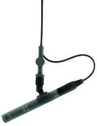 This cable hanger suspends a microphone of the Colette Modular System from its cable, and allows it to be set both vertically and horizontally to nearly any angle. A tie line can be attached to a loop in the cable to keep the microphone absolutely steady.
