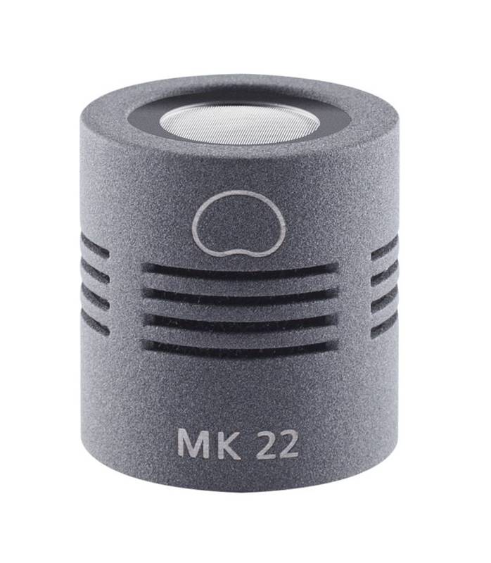 The MK 22 has been developed for use as a spot microphone. It unites the strengths of the MK 4 and MK 21 capsules. Its directionality is only slightly less than that of the MK 4 cardioid, while its sonic character is reminiscent of the MK 21 wide cardioid. Its directivity is essentially constant throughout the frequency range. Its inherent low-frequency response is somewhat more pronounced than that of the cardioid, while proximity effect is somewhat less.