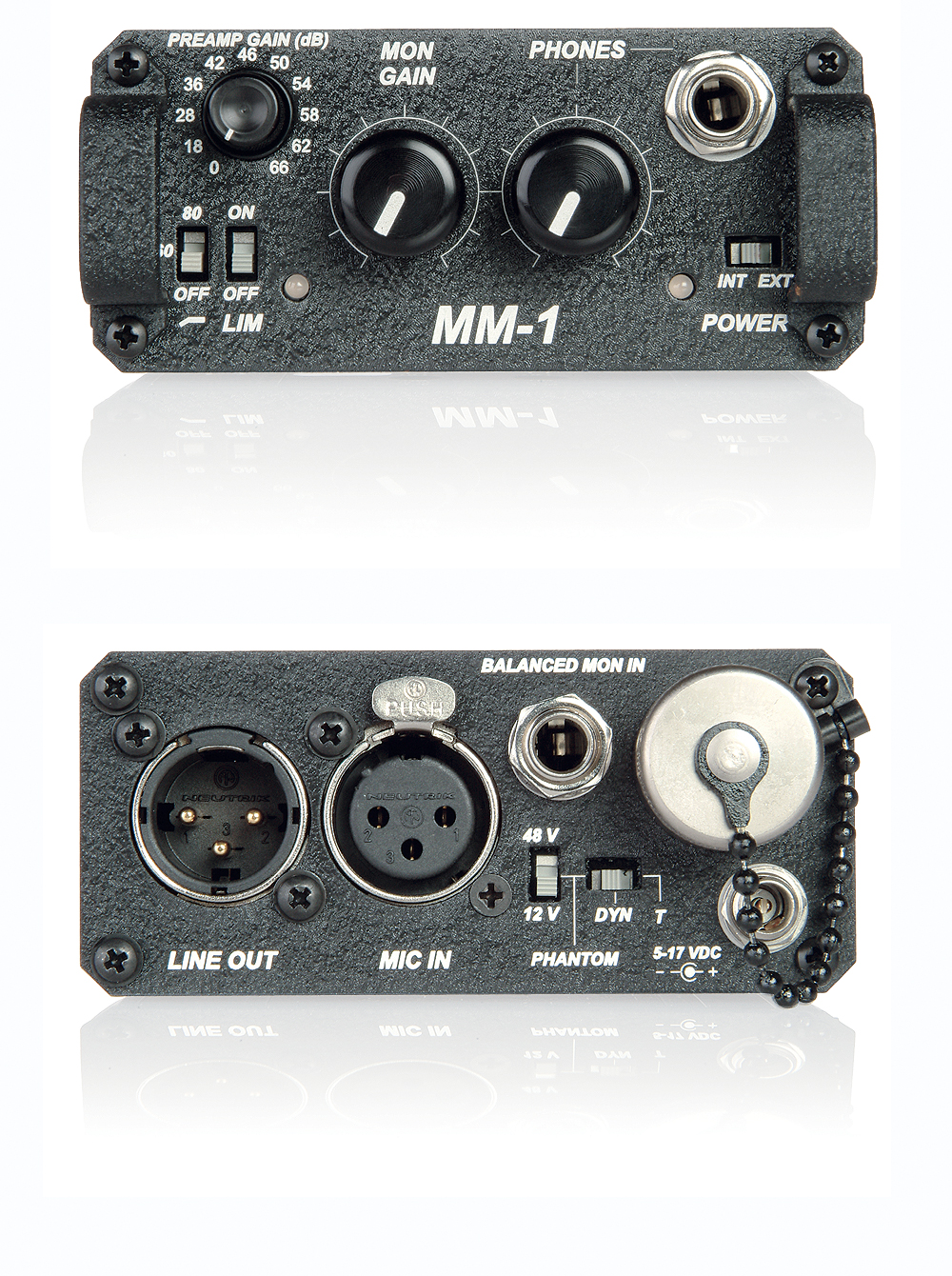 Battery-powered microphone preamplifier with headphone monitoring. 48 V phantom and T-power, limiter, high-pass filter. 2-AA or external DC powered.