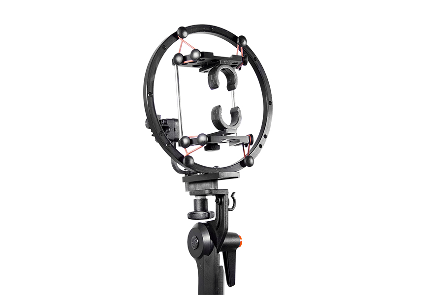 This Windshield Kit features a Suspension setup for XY/MS stereo arrangement with two compact condenser microphones in an AC Windshield features the traditional metal hoop and rubber band arrangement with an adjustable XY/MS mount allowing four different angle positions for the microphones. The mount is suspended centrally in the hoop via the four rubber O rings.
