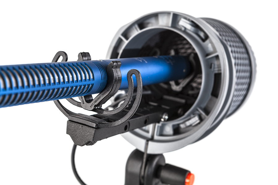 The Super-Shield Windshield is made up from two “pods” which attach to the central chassis. They are lightweight, durable baskets made from flexible grey plastic netting with a screening material attached. The windshield has a twist lock system onto the suspension chassis ring, and when fitted completely surround the whole microphone, connector and suspension. This system creates a still volume of air around the microphone, which provides excellent wind-noise reduction, with minimal High-Frequency loss.
