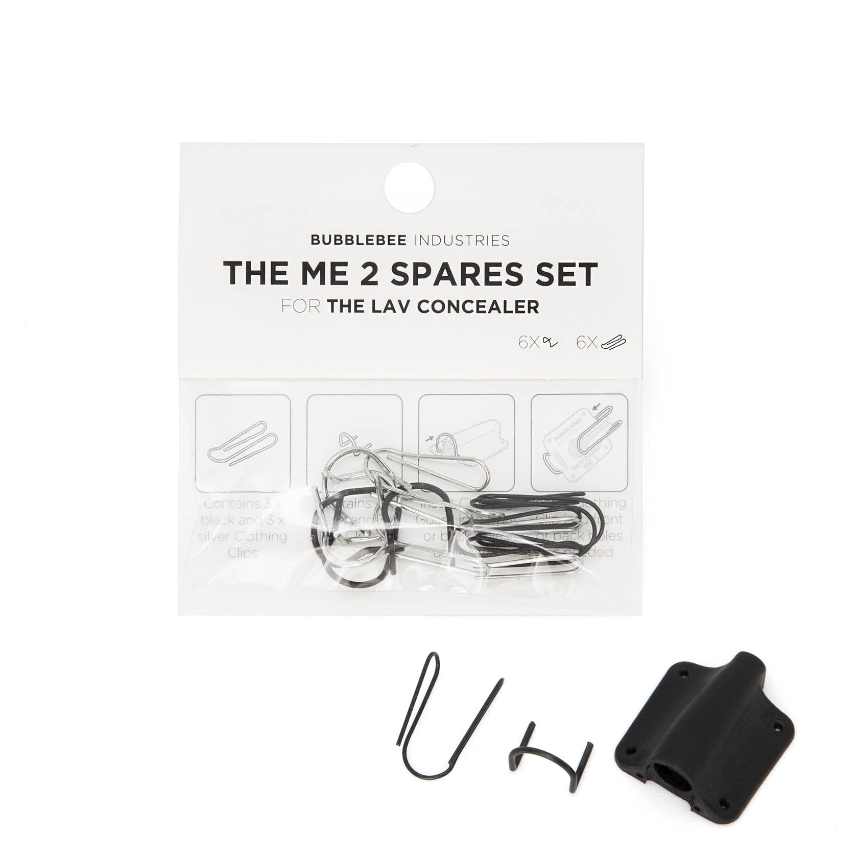 A 'set' of metalwork consists of a metal Fabric Guard and a metal Clothing Clip. The Spares Set has 3 x silver sets (for white Lav Concealers) and 3 x black sets (for Black Lav Concealers), making 6 sets in total.