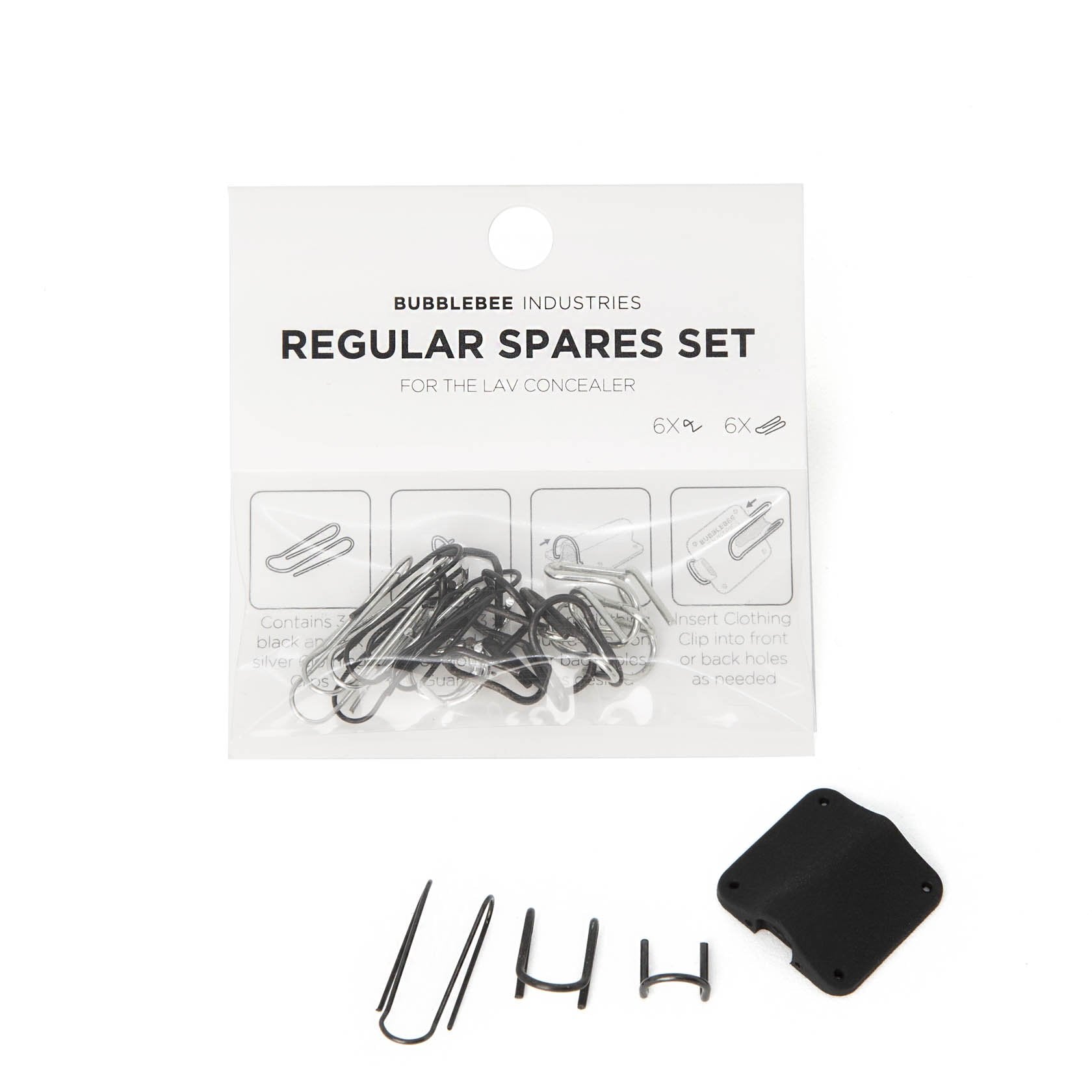 A 'set' of metalwork consists of a Fabric Guard, Fabric Guard Extreme and a Clothing Clip. The Spares Set has 3 x silver sets (for white Lav Concealers) and 3 x black sets (for Black Lav Concealers), making 6 full sets in total.