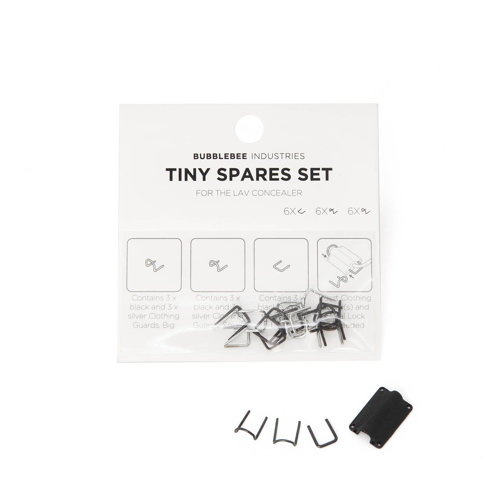 The Tiny Spares Set for The Lav Concealer contains 6 full sets of metalwork replacements for your tiny 'subminiature' format Lav Concealers; ie. Like the Lav Concealer for DPA 6060.