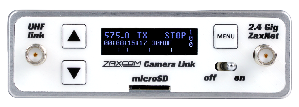 The TRXCL4 sends audio with embedded timecode to camera via a UHF signal to any Zaxcom receiver – QRX200, RX200, QRX235 or MRX/RX-4. It can also send audio and timecode via ZaxNet’s 2.4 GHz signal to an ERX3TCD receiver, or remote control commands to any Zaxcom digital recording wireless transmitter.