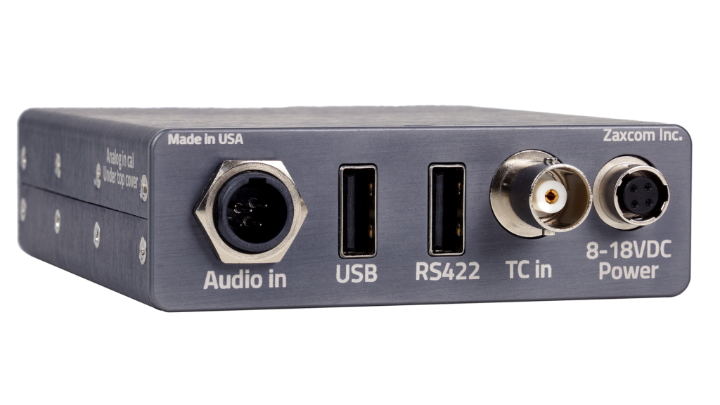 A TA5 audio input offers balanced stereo line level or sample rate converting AES. The BNC connector provides timecode in.