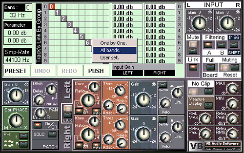 | If you imagine 10 bands onto which you can apply 8 different effects - input gain (Gain IN), phase correlation control (Cor. Phase), phase shifting (L/R), delay, stereo balance setting (Panoramic), compression, post-gain compression (Gain Out) and, at last, a limiter - then you can also imagine the above matrix, where processings appear on the vertical axis and frequency bands on the horizontal axis, giving you the possibility to de-activate/re-activate one single processing for a particular band or for all bands at once, or even all processings at once for a particular band. |