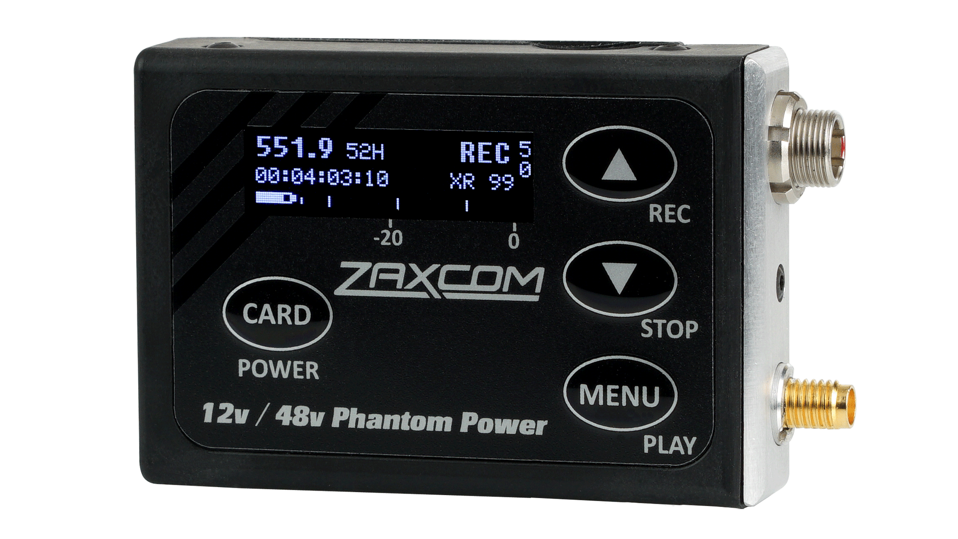 The ZMT3-Phantom provides a 114dB dynamic range with no limiting or compression distortion. Phantom power is selectable in 12, 24, 32 and 48V. External audio and battery status levels are easily visible for the operator.