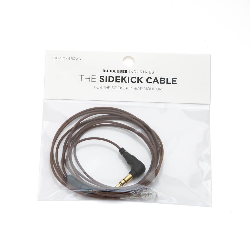 The brown stereo variation of The Sidekick Cable from Bubblebee is an accessory cable for the Sidekick In-Ear Monitor (sold separately). This cable is Kevlar reinforced making it super strong and durable. The Sidekick cable loops behind the ears so that it's easily concealable under hair and clothing. In addition, the cable is 48" long and splits to the left and right ear from a single 3.5mm mini-jack.
